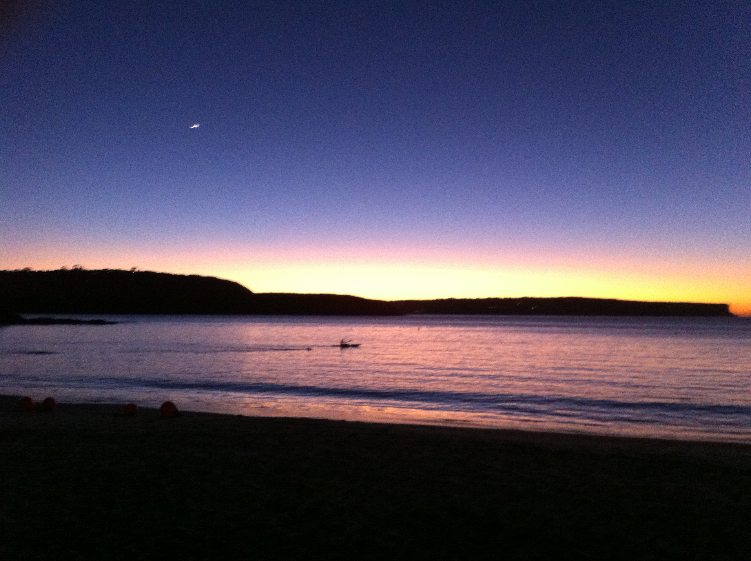 Kayak and swimmer partnership, Sonny and Marty, in the waters off Balmoral last Saturday morning, under a sliver of moon…